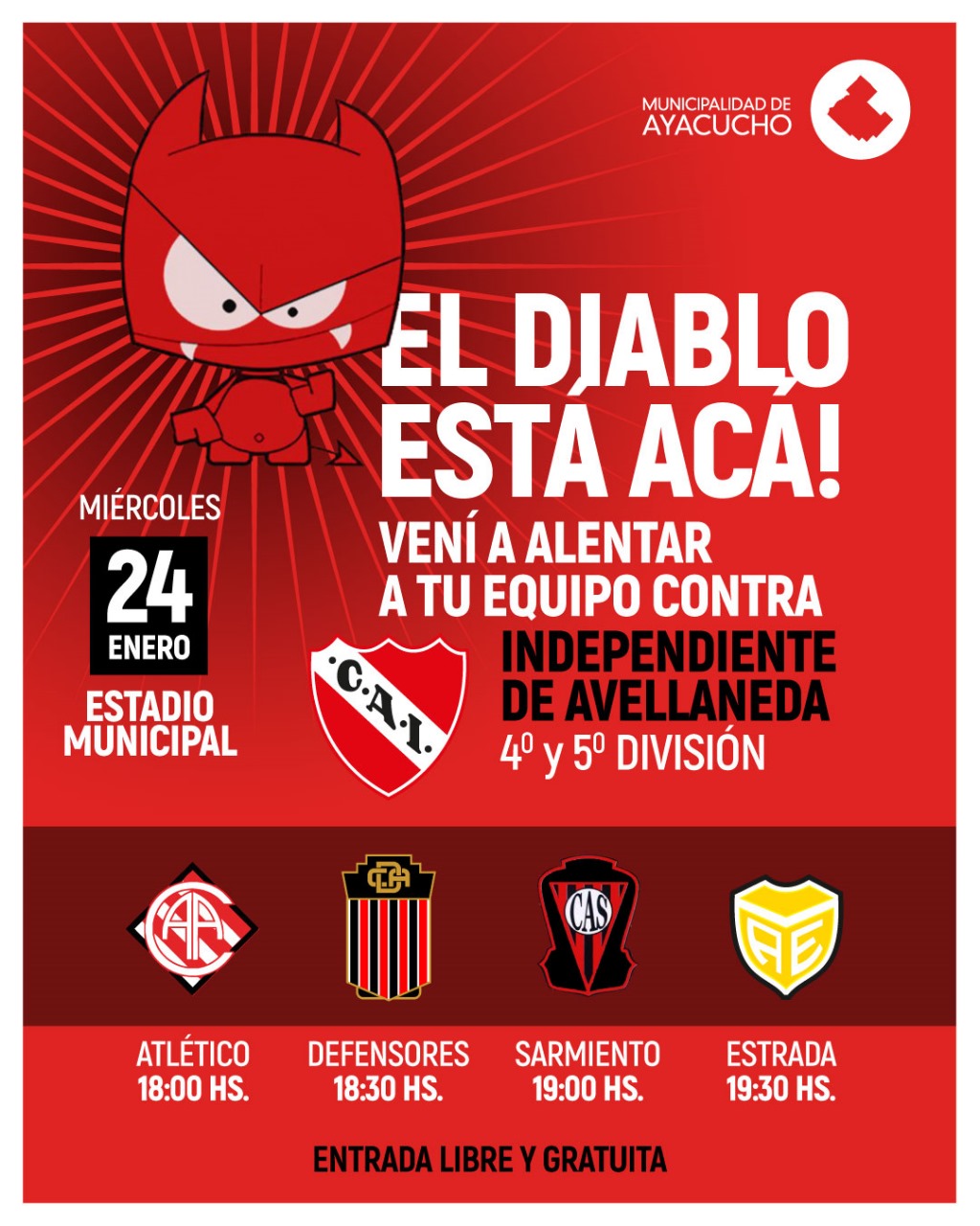 Los planteles de 4ta y 5ta división del Club INdependiente de Avellaneda quienes se encuentran realizando la pretemporada en nuestra ciudad enfrentaràn esta tarde noche a combinados locales en una práctica de fútbol en el Estadio Municipal.