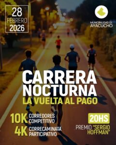La Municipalidad de Ayacucho confirmó la fecha para la carrera nocturna “La Vuelta al Pago”, que se correrá por las calles de la ciudad el sábado 𝟐𝟖 𝐝𝐞 𝐟𝐞𝐛𝐫𝐞𝐫𝐨 𝐝𝐞 𝟐𝟎𝟐𝟔 desde la hora 20.